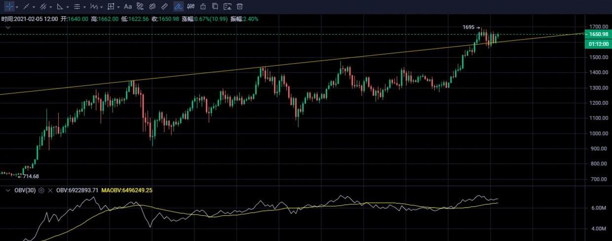ETH:強勢上漲,H度也增加持倉,突破鍥形態回踩不破補倉現貨。合約方面目前可以以1600美金為支撐位,根據行情的變動輕倉多單介入。