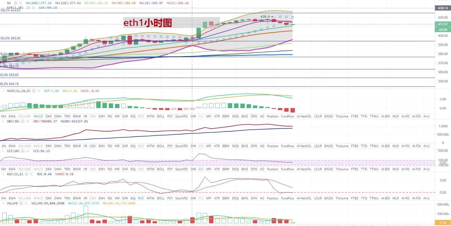 ETH行情分析:持幣者小時級別圖中,自昨日以太坊強勢突破400后,昨日以太坊整體上的行情一直保持上攻姿態,高點一度觸及420一線,但行情并未突破箱體頂部,以至于行情回落到413附近,下方MACD多頭量能跟隨幣jia回落轉變為空頭,目前空頭量能持續釋放中。