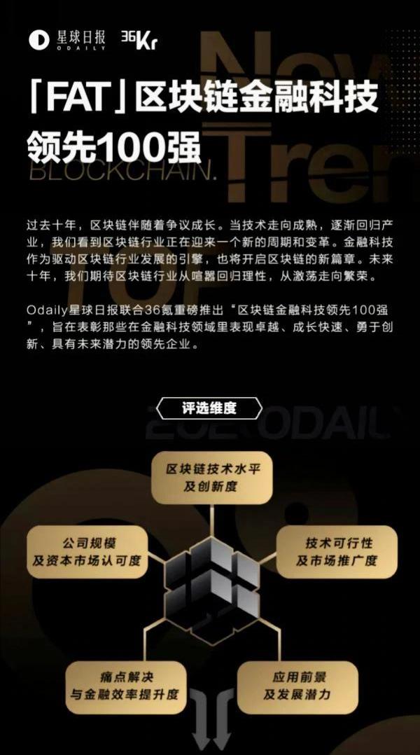 此次榜單主要是基于36kr與星球日報長期對于區塊鏈與加密領域的追蹤報道、采訪調研以及綜合數據,并且從公司規模及資本市場認可度、區塊鏈技術水平及創新度、技術可行性及市場推廣度、痛點解決與金融效率提升度、應用前景及發展潛力五大維度遴選出100家領先區塊鏈金融科技行業的優質企業。