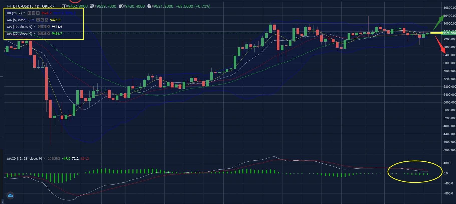 再從4小時圖來看,現在BOLL通道已經開始緩緩張口,但是中軌依然是平行前進,隨著前兩天的強勢反彈,行情從下軌支撐一直到觸及上軌壓力,現在行情處于BOLL中上軌區域內,上方受到上軌強制壓力,MA10和MA30均線粘合在BOLL中軌處,形成下方支撐位;下方能量指標MACD快慢線金叉運行有上穿零軸趨勢,多頭動能持續釋放中;綜合來看,易天(aphz8705)認為9400-9600區間已成為關鍵區域,向上向下破位都有可能,所以日間行情重點關注9400、9600價位!