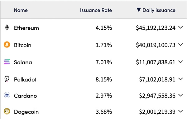 這還是在以太坊切換到 PoS 之前(Solana 和 Avalanche 已經是 PoS 了)。未來,ETH 的發行量下降 90%,同時加強了其安全機制。