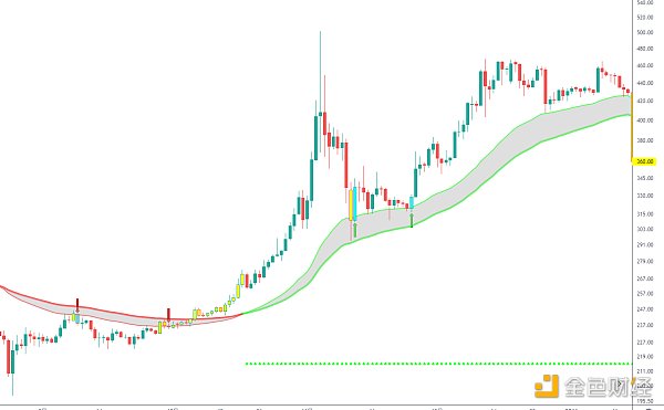 如圖所示,BTC下方周線指數已下滑至圖中圓圈0軸附近,價格也已跌至折線綠轉紅區域,并且下方快慢兩線也已跌至紅色虛線位置,本周反彈陽線帶動快線拐頭上行,后面有金叉慢線跡象,只是時間問題,我們看2014年和2018年熊底也都具備以上特征,后面長時間震蕩筑底,然后發力重新站上,指標線上行然后啟動新一輪牛市行情。