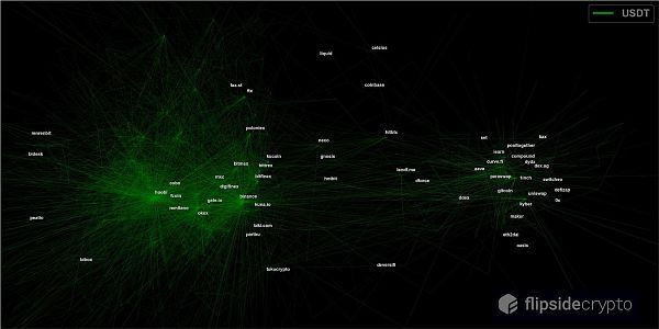 USDT在DeFi世界中的交易更多是DeFi之間的交易,DeFi同中心化交易所的USDT交易非常稀疏,并且從圖上難以判斷中心化交易所的源頭。這表示,USDT在DeFi世界中的交易生態是自行產生的,同任何一家中心化交易所都沒有關系。