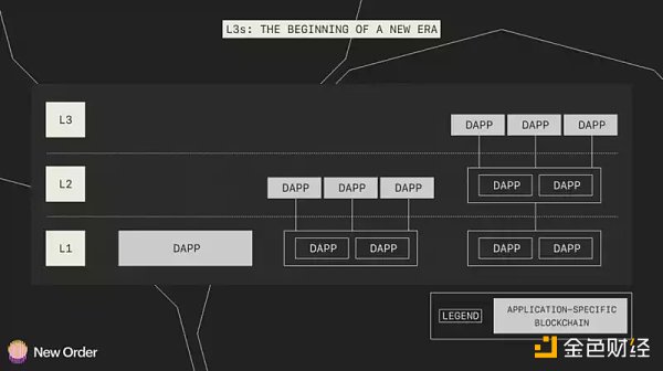 Layer 2 (L2) 通過降低 gas 費用和增加吞吐量來提高以太坊的可擴展性。由于這些可擴展性因素,以及存在的權衡,L2 必須選擇針對特定項目進行優化。Layer 3 (L3)是基于 L2 構建的特定于應用的區塊鏈,旨在減輕這些權衡并進行更多改進。它們類似于 Cosmos、Avalanche 和 Polkadot 等應用鏈環境,但受益于構建在模塊化區塊鏈協議棧而不是單體鏈協議棧上。因此,部署一個完全模塊化的區塊鏈基礎設施堆棧,包括一個通用的 L2 以及可定制的 L3,將標志著單體應用鏈生態系統時代的結束,以及去中心化應用開發新時代的開始。
