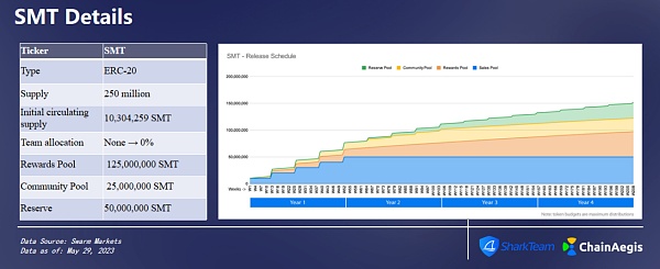 SMT供應總量為2.5億,其中50%分配給獎勵池,10%分配給社區池,20%留作將來使用,預期5年線性釋放。