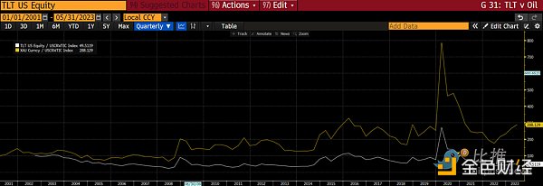 TLT ETF(20 年以上美國國債)除以 WTI 石油現貨價格(白色)黃金除以 WTI 石油價格(黃色)