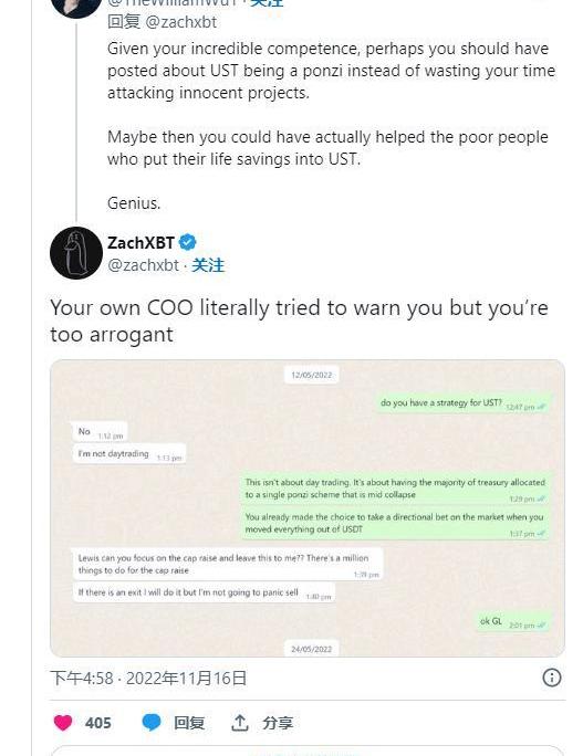 吳回擊說事后看來很容易批評他的投資,因為沒有人知道Terra傳奇將如何發展。一位Twitter用戶Norm指出,吳的首席運營官曾警告他可能會在崩潰發生時警告他,這否定了“事后諸葛亮”的說法。