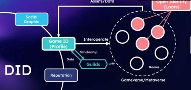 而想要做到這一點,就需要玩家擁有一個通用的身份格式,即游戲版的DID,其記錄著玩家在各個游戲中的經歷、聲譽、資產和成就,同時由于去中心化身份的通用性,該身份所關聯的社交關系也可以自由的帶入到不同的游戲中,這里我們將這種DID稱為GameID,其與其他的身份數據構成了用戶完整的DID形象。