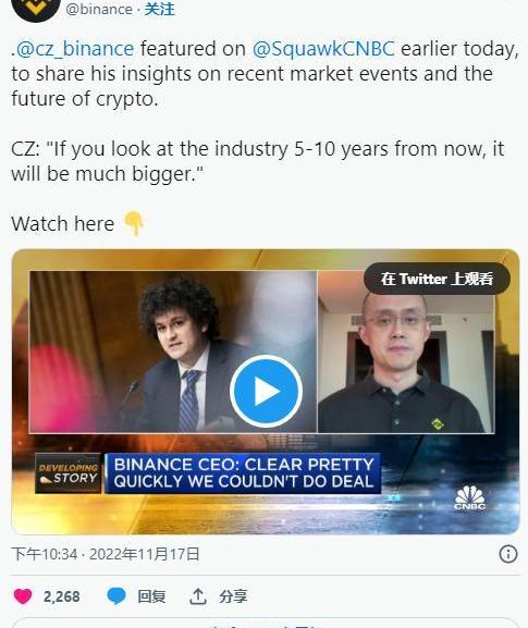 Binance首席執行官Changpeng'CZ'Zhao就加密貨幣的未來以及交易所倒閉前FTX前首席執行官SamBankman-Fried(SBF)廣為人知的推文風暴發表了看法。