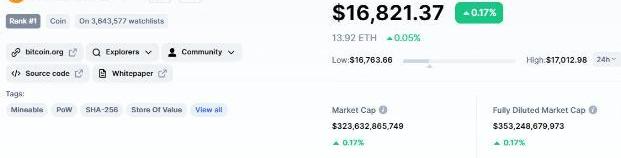 比特幣現價為16810美元,24小時交易量為190億美元。BTC/USD貨幣對在過去24小時內上漲了近0.15%,而CoinMarketCap目前以3230億美元的實時市值排名第一。