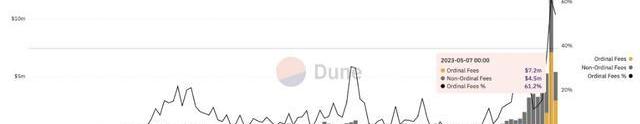 現階段,包含部署/鑄造/轉賬在內的BRC-20協議相關交易量已經超過了非Ordinals交易量,5月7日數據顯示,BRC-20協議交易量在比特幣總交易量中的占比一度達到65%高位。