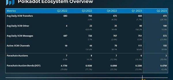 在整個第二季度,Polkadot仍然致力于其網絡的開發和擴展,在質押、資金使用和平行鏈活動等關鍵網絡等基礎方面表現出一致性。在此期間取得的值得注意的里程碑包括推出OpenGov、引入先進的治理模型以及在Polkadot主網上引入XCMV3。XCMV3已經展示了XCM用例的增加,預計未來將進一步增長。此外,平行鏈正在進行的插槽拍賣租賃重新簽署導致了DOT債券的激增。