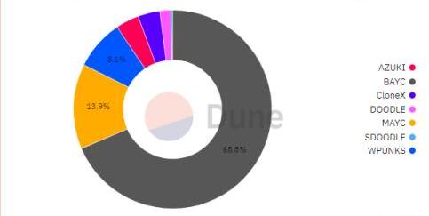從BendDAO的業務來看,Bend只對BAYC、CryptoPunks、MAYC、Doodles、SpaceDoodles、CloneX以及Azuki這幾個藍籌NFT提供借貸服務。這些藍籌NFT中,大猴子BAYC和小猴子MAYC屬于絕對的大哥,在Bend中的抵押品價值占比超過83%。