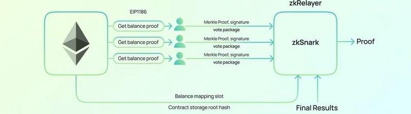 存儲證明,證明投票人的以太坊地址沒有代幣;存儲證明,證明投票人的以太坊地址沒有鏈接到一個BabyJubJub密鑰;證明BabyJubJub密鑰已經投票。中繼者