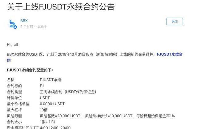 2018年10月,FCoin日本版上線,不少人看空旗下代幣FJ。BBX順勢推出了FJ/USDT永續合約,乘勢收獲數千用戶,該合約也在一個月后下線。除了FJ,BBX還曾上過GTC、HT、Grin等紅極一時的代幣永續合約。