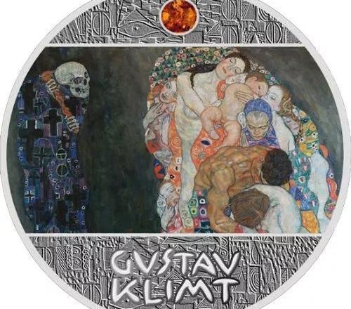 克里姆特,2019950,紐埃2019年克里姆特名畫死亡與生命鑲琥珀彩印銀幣,面值:1新西蘭元年份:2019年金屬:999銀重量:17.5克直徑:50毫米發行:555枚