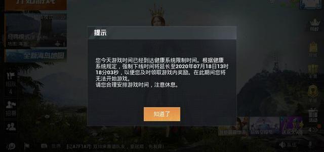 如圖所示,由于連續的“落地自雷”長達8小時之久,玩家已經達到了當天的健康系統限制時間,所以被光子強制下線休息,同時也提醒合理安排游戲時間。