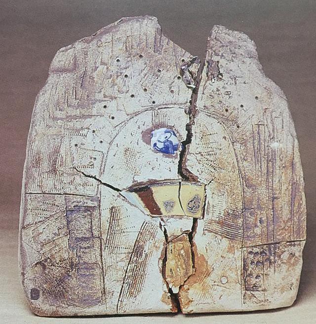 從這樣的視角,不難明白何以柯和根在陶藝制作中常常使用一些非常規的手法。泥條的疊加擠壓,表面的打磨刮劃應當說是一般做法了,竅門只在于如何運用而已。如果以上這些算不上柯和根太個性化的方法,鑲嵌的運用卻往往顯出他的獨具心裁。成品瓷的碎片本來是一種累贅,但在他的作品中,是最具有生機的提神之處,加上色彩、裂口的組合,竟成了畫龍點睛一筆。這樣大膽而出乎人之意料的運用,既是特色,更是工力。