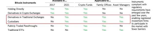 其結果是,近期流入比特幣的交易規模比2017年更大,當時散戶資金流規模較小。然而,值得注意的是,機構參與的程度仍然主要是規模較小的公司、對沖基金和家族理財室,而不是規模較大的傳統機構配置者,在這些機構配置者中,相關工具的市場規模仍然很小。