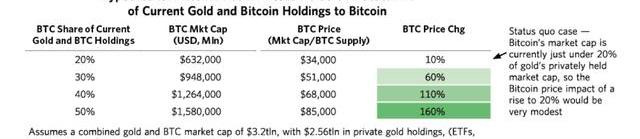 就供應/需求情況而言,雖然供應是已知的,但是在一段長時間內的長期需求就很難講了,這主要是出于我前面提到的原因。例如,由于我認為比特幣是一種類似黃金的另類資產,我請橋水的麗貝卡·帕特森和其他人進行了一些計算——如果私人持有黃金,然后從其中提取一定比例,把它們轉移到比特幣,進行多樣化,情況會怎樣?舉個例子,如果私人持有的黃金中有10%、20%、30%、40%或50%被轉移到比特幣上,以實現資產多樣化,或者如果10%或20%的比特幣礦工想要多樣化投資于黃金和股票等其他資產,或者如果政府想禁止使用比特幣,諸如此類,又會是什么樣子呢?他們描繪了一幅高度不確定的圖景,你可以閱讀下面的完整報告。這就是為什么對我來說,比特幣看起來像是一個關于高度未知的未來的長期期權,如果我要投入一筆錢買比特幣,不介意損失大約80%的比特幣,我得考慮考慮要投入多大一筆錢。