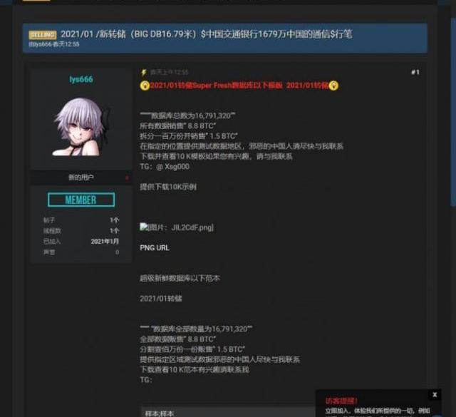 2021年1月初,有黑客在暗網發布消息稱,已經掌握交行1679萬條用戶信息,販賣價格為8.8枚比特幣,甚至還留下了部分數據樣本,顯示為部分交行用戶的借記卡號、姓名、家庭住址、開戶分支行等信息。