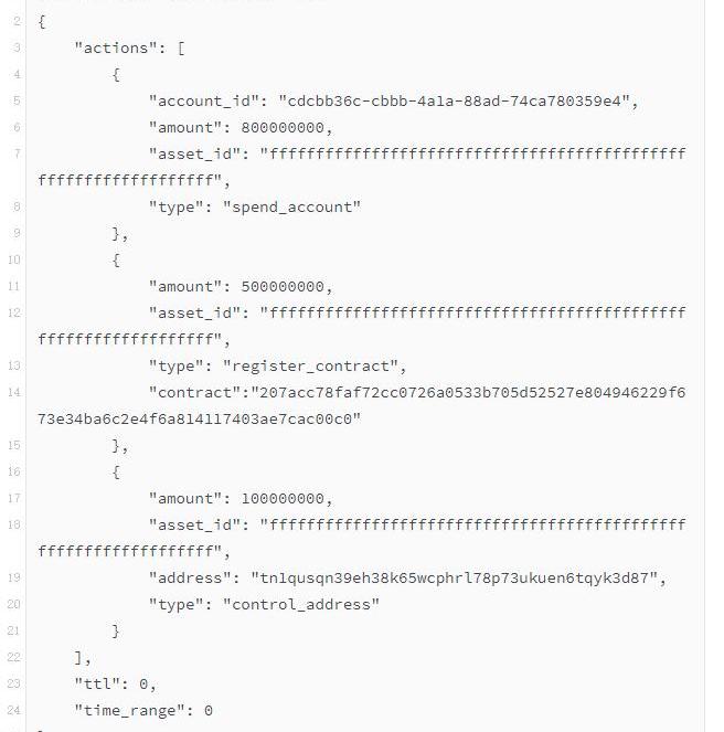 構建注冊合約的交易結構,其中type為"register_contract",同時將本地創建的合約id帶入contract中