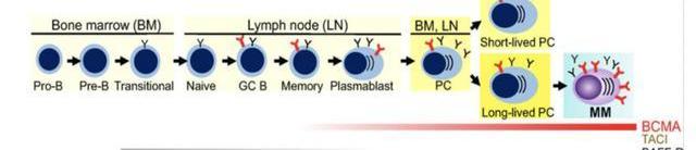 BCMA:又名B細胞成熟抗原,BCMA過表達可誘導蛋白激酶B、絲裂原活化蛋白激酶和核轉錄因子kB信號級聯增強促進MM細胞的生長和存活,通過介導下游信號通路,BCMA在細胞的存活、增殖、轉移和耐藥中起著關鍵性的作用。研究表明,BCMA主要在惡性增殖的B淋巴細胞中高度表達,而在初始B細胞、CD34陽性造血干細胞和其他正常組織細胞中不表達。這些特性使得它成為MM治療的理想靶點。