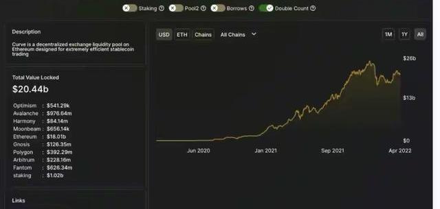 我們可以看到這張在DefiLIama馬上面這張圖表圖上面的第一名就是Curve(CRV)他的鎖倉量是目前最多的,他也兼容了蠻多其他的鏈像是以太鏈、polygon雪崩鏈跟其他很多。我們可以看到這張圖是CRV鎖倉量的一個圖表,目前所銷量已經高達了200億美金是目前市場上最大的誒efi,在今年1月的時候鎖倉量還高達了240億美金量是真的非常多的,在鎖倉上其實是有些限製的但為什么還是有這么多人在質押Curve,他最大的賣點就是這種樂高式的金融組合,現在已經可以做到5層還是6層的樂高式疊加收益,這真的是蠻大一個賣點之一就是滾到錢再繼續滾滾到錢還繼續滾這樣把時間周期拉遠來看真的是蠻可觀的,在Curve的治理上會用到我們剛提到那個veCRV。