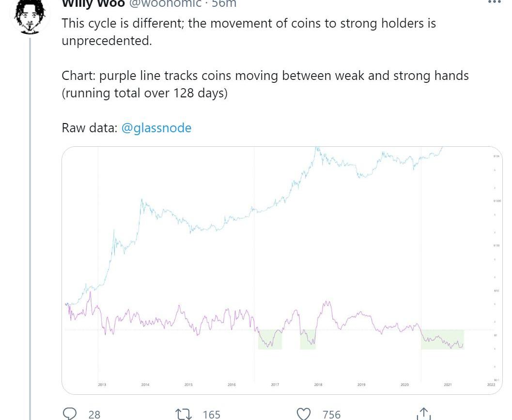 XRP/HKD+0.73%加密貨幣分析師WillyWoo在推特發文表示,當前的市場周期與以往不同,加密貨幣前所未有地流向強勢持有者。他認為不可能進入熊市。從本周的價格走勢來看,這一點很明顯。WillyWoo表示,加密貨幣進入公司負債表可能產生影響。灰度比特幣信托目前占比特幣供應量的3.5%,只允許比特幣流入冷存儲庫。2017年以來規模不斷擴大的杠桿市場可能也起到了一定作用。大量的代幣為了交易而移動,而杠桿作用較少的代幣在相同的投機量下也需要移動。在比特幣的早期,它被當作一種貨幣使用,所以比特幣在流動性更強的持有者手中流通是有道理的。