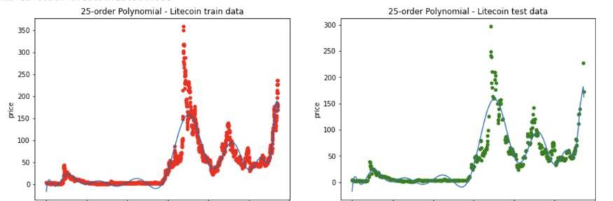 我對Litecoin的歷史價格進行了簡單的多項式回歸,使用5、25和80的階數。在每種情況下,R2值將提供一些關于模型在測試數據集上的擬合度好壞的信息。