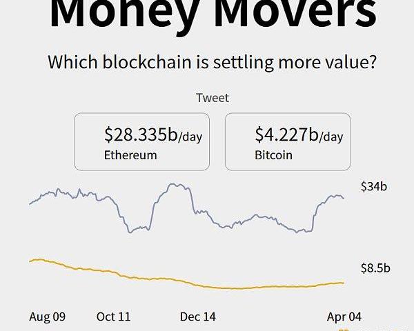 根據money-movers的數據,以太坊目前鏈上媒體轉移、結算近300億美金的資產,而比特幣這個數據是40+億美金,已經差了一個數量級。