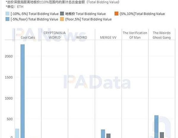 PAData進一步抓取了10個頭部項目在地板價±2%的價格范圍的出價總額,和6個熱門項目在地板價±10%的價格范圍的出價總額,以觀察不同項目競價深度的結構。總的來看,頭部項目在地板價和高于地板價1%的范圍內深度最佳,熱門項目在低于地板價5%的范圍內深度最佳。