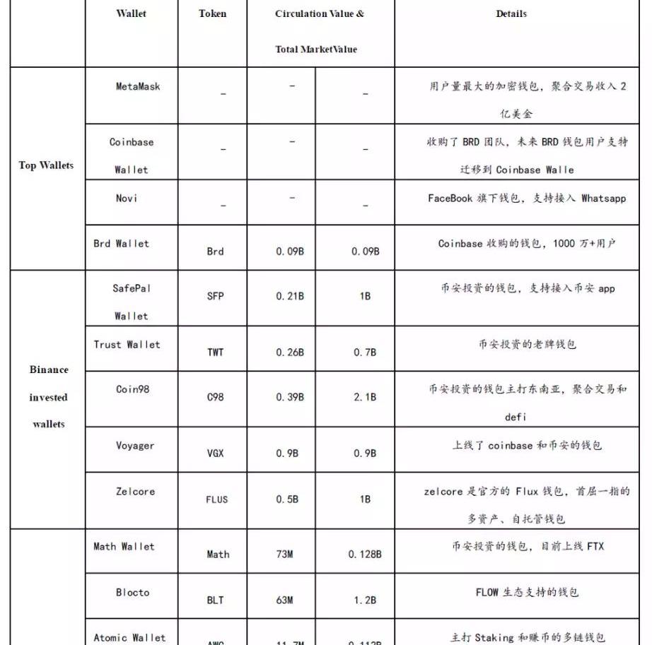 從公開的資料來看,目前頭部錢包幾乎被大公司所占駐,要么是直接開發作為其產品,要么是入股投資。下表中我們將目前市場上常用的錢包作了分類,一類是頭部巨頭公司直接開發的錢包如Metamask、Coinbase錢包、Facebook推出的錢包,另一類則是幣安投資的錢包如我們常用的TrustWallet、C98等。最后一類是新晉的增長較快的錢包。在第四列和五列中給出了其流通市值和總市值。詳細描述如下表所示: