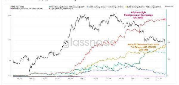 這將所有交易所儲備持有的穩定幣推高至411.86億美元的歷史新高。我們還可以看到BUSD的主導地位顯著上升,其交易所儲備超過了214.4億美元。這可能是幣安最近向BUSD進行穩定幣整合,以及其作為世界上最大交易所的主導地位日益增長的結果。