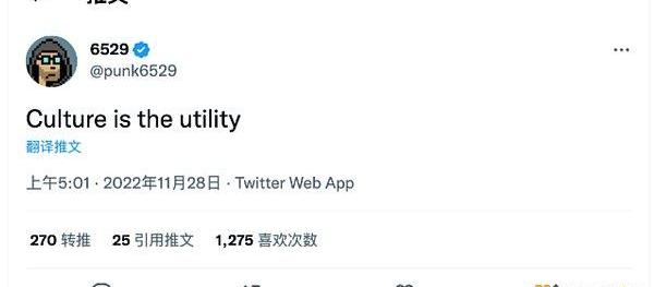 因此,Nft的效用分為兩種,一種是偏功能性的,另一種則從精神層面建立效用,讓持有人可以更好的表達自我、獲得認同共鳴、找到歸屬感,進而實現社會傳播,不斷擴大受眾網絡,實現價值增值,也就是文化即效用,nftOgPunk?6529表達過相同觀點:cultureistheutility。