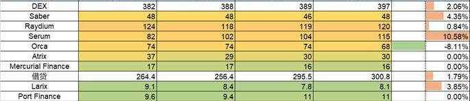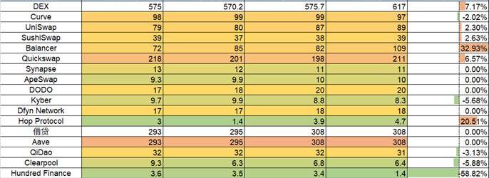 本周TVL總量下降0.73b,下降幅度為1.33%;BSC鏈出現流量回歸的姿態,連續兩周TVL總量漲超10%,重新回到第二名,另本周Optimism出現較大下跌,與之對應的Arbitrum承接了此部分TVL,可能是受到Nitro網絡升級影響,短期內出現交易量和交易用戶人數的雙增。