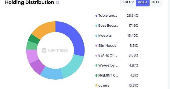 該地址所持有的現估價值最多的NFT是DigiDaigaku,占據了該地址所持有總數的30.81%。其次,位居第二的是Meebits。值得注意的是,在目前的集合中,TablelandRigs是@kdimes00買入價值最高的項目,占據28.34%,沒有賣出,收益為負。
