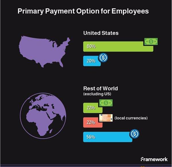 超過80%的公司總部都設在美國,這些受訪者都將美元作為主要支付方式,這通常是為了保障員工更便捷地處置薪資收入以及消費,以及更方便地向員工發放福利,畢竟一般情況下福利供應商都不會支持穩定幣。但也有向勞務合同甚至全職員工以USDC形式發放薪資的公司。
