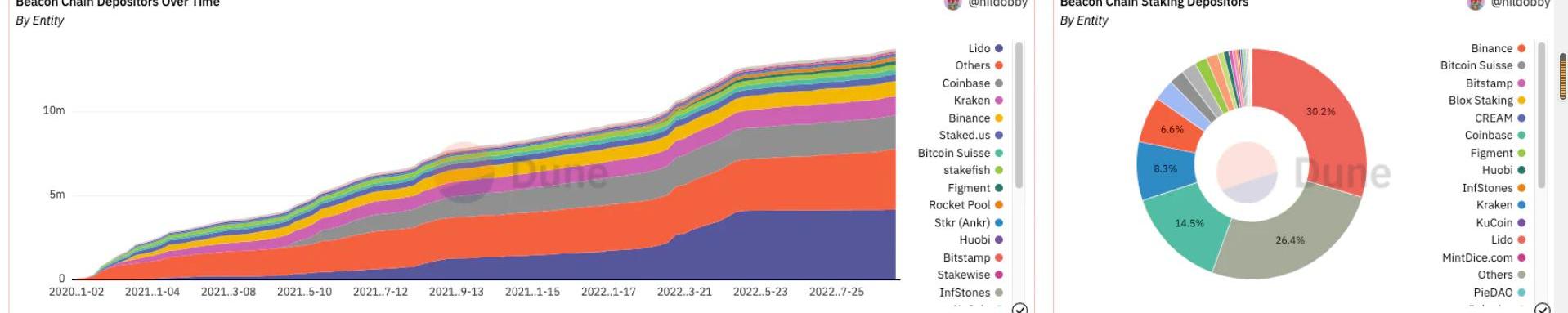 在這個背景下,以太坊也離合并之日越來越近。人們開始擔心政府為了阻止非法交易的發生,網絡驗證者可能會被強制審查區塊內容。目前包括Coinbase和Binance在內的中心化交易所控制著大量的質押代幣,并且大多數用戶都是通過這些中心化交易所提供的產品來參與加密活動。