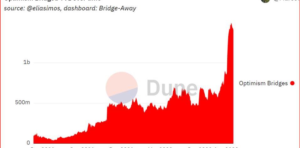 而6月1日OP代幣剛發行時,跨鏈橋TVL僅6.67億美元,它在兩個半月的時間整體上漲了113.94%。