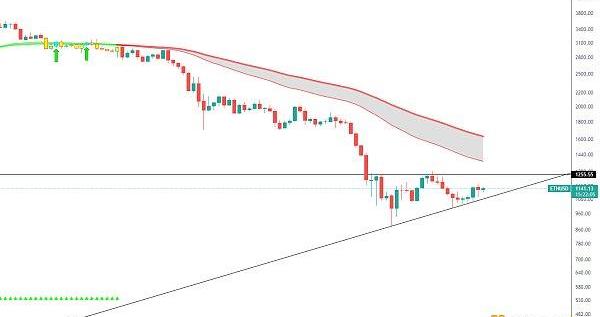 目前ETH近期走一個上升三角,上方主要壓力位于頸線1250-1280區域,站上也將有望挑戰紅色軌道壓制區。