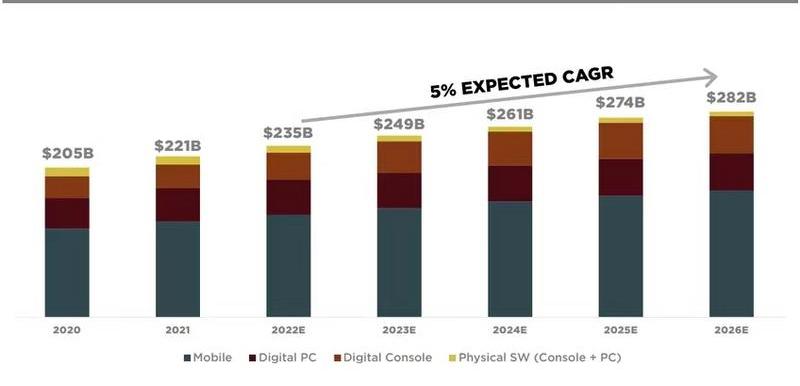 根據TakeTwo的數據,全球電子游戲市場規模每年為2350億美元。其中主要是手機游戲,占總營收的60%。
