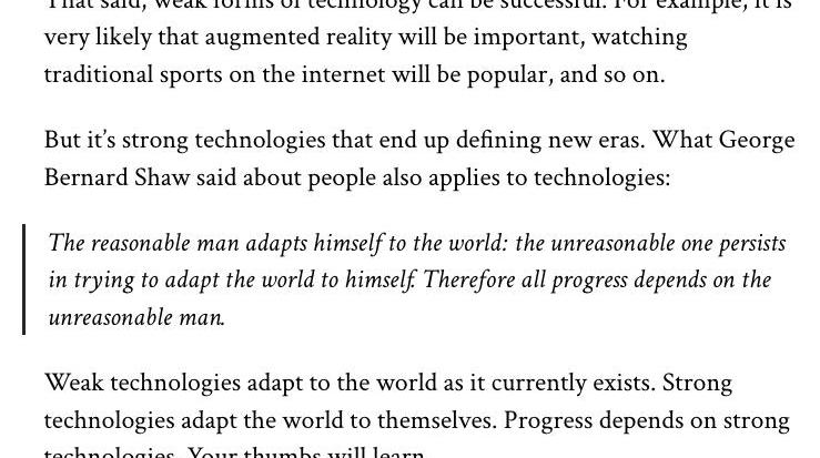 同時,鏈改游戲的模式也是一種cdixon講的「弱科技」模式,可能看起來更接近主流受眾,但是不會是下一個時代。弱科技的概念來自于cdixon的文章《強科技與弱科技》,一個技術總是以成對的形態出現。一種是弱科技版,看起來更接近主流,更容易落地;另一種一開始更像是一種玩具,但是卻有開創一個新時代的潛力。比如,18,19年搞的很多無幣區塊鏈項目,還有聯盟鏈+實體經濟,供應鏈金融的項目就是弱科技;以太坊和Defi就是強科技。