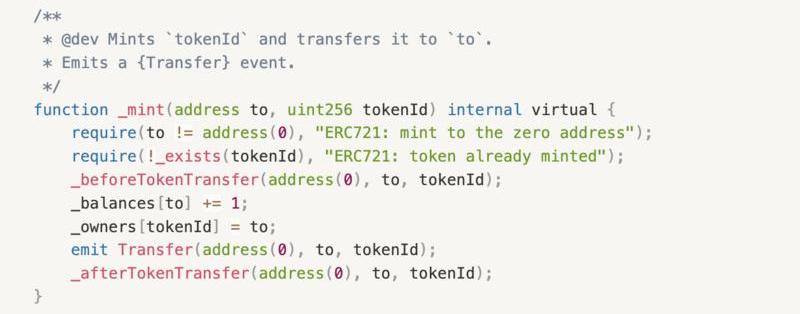 中間有_beforeTokenTransfer和_afterTokenTransfer屬于虛函數,作為標準,是讓項目方可以再不修改標準協議的情況下增加一些特定的邏輯代碼用的。
