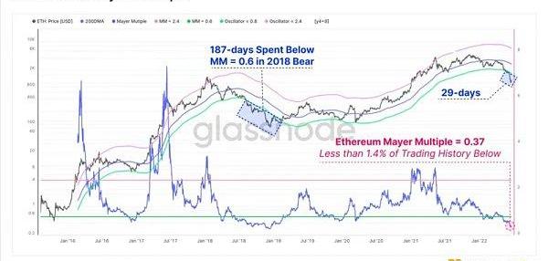 梅耶倍數區間為?0.6,表示下行偏離水平,ETH?所有交易日中約有?10%?低于該水平。2018?年的熊市中,ETH?在最糟糕的價格走勢中低于該區間?187?天。在目前的市場上,?ETH?自?6?月初以來一直低于這一區間,目前已低于該區間?29?天。