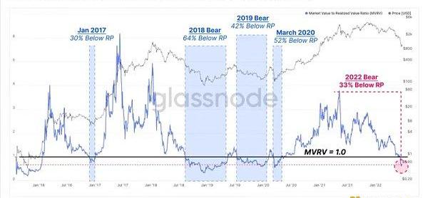 現貨價格低于實現價格的情況并不常見,目前的市場是過去六年來的第三次。最近的兩個事件是?2020?年?3?月的新冠危機和?2018?年?11?月的市場投降事件,這兩個事件都使熊市周期見底。