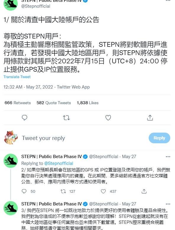 據公告內容顯示,為積極主動響應相關監管政策,StepN將清查中國大陸帳戶,若發現中國大陸地區用戶,StepN將依據使用條款對其賬戶于2022年7月15日24:00停止提供GPS及IP位置服務。如果用戶預期長期會在該地區的GPS或IP位置登陸及使用帳戶,官方鼓勵用戶自行決策處理應用內的資產。在此期間,更多細節將通過官方社交媒體公告、郵件、應用內提示等方式通知使用者。