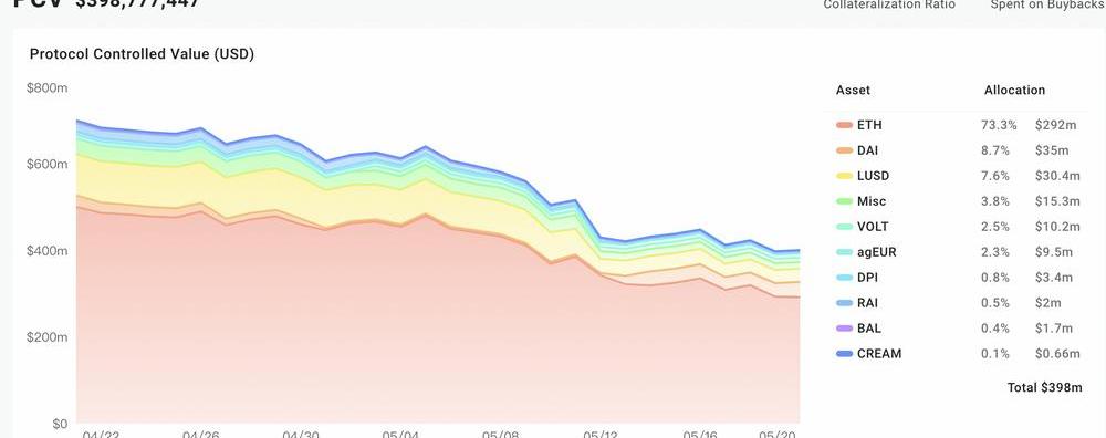 一開始的FEI以ETH鑄造,現在已經改為DAI,PCV中的絕大多數資產依然為ETH。根據FeiProtocol官網數據,協議鑄造的FEI約為3億,用戶鑄造的FEI約為2.3億。PCV持有的資產價值3.98億美元,其中ETH占比73.3%,DAI占比8.7%,LUSD占比7.6%。