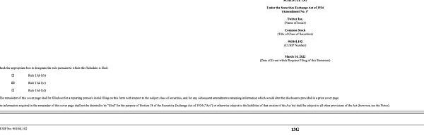 他的律師在3月14日向SEC提交了增持股票的申請文件。這份持股申請顯示,他計劃以被動投資的方式收購Twitter公司9.2%的股份。被動投資又稱為靜態投資,字面意義上指的是通過最小化買賣來最大化回報。