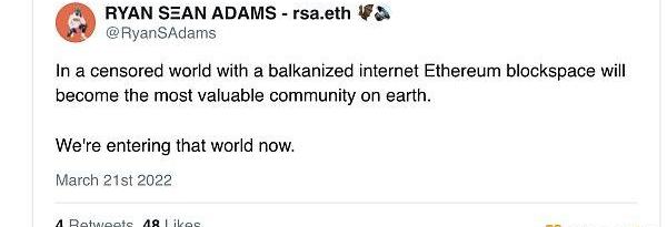 在一個互聯網分裂的審查世界中,以太坊區塊空間將成為地球上最有價值的社區。我們現在正在進入那個世界。——@RyanSAdams”